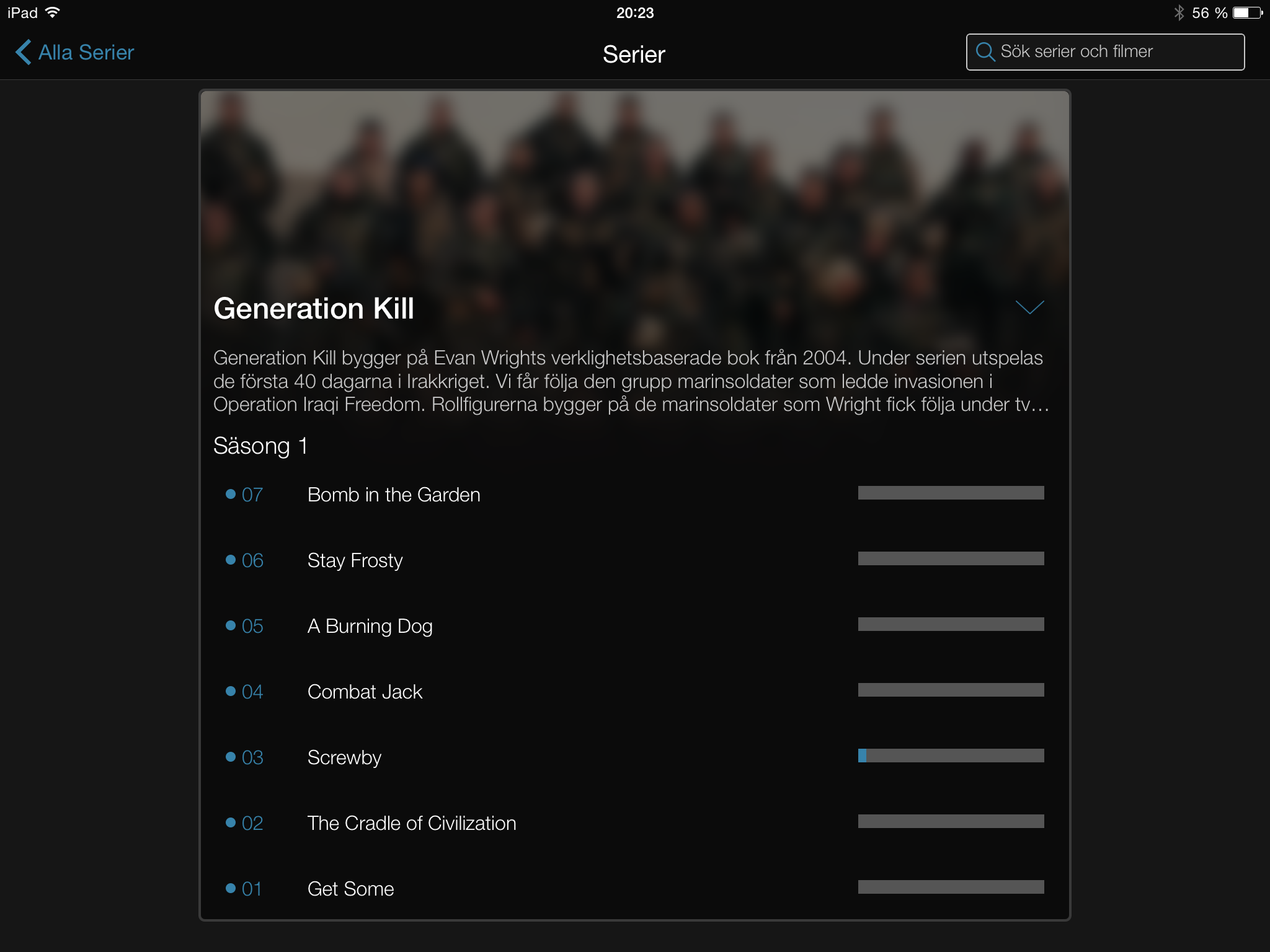 | “Hemsidan” för en TV-serie på iPad. Notera dock att HBO Nordic glömt bort att avsnitt 01 och 02 tittats på nyligen. |