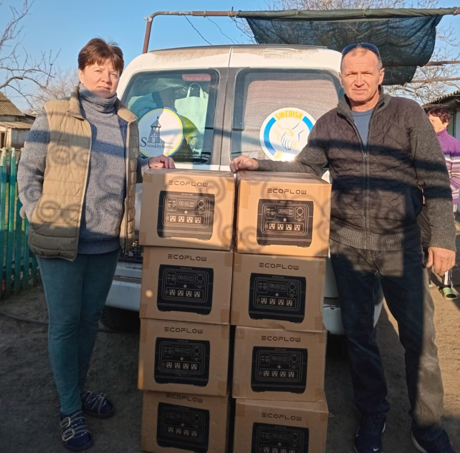 Föreningen Svenskbyborna levererade bland annat Ecoflows och ett 5.5 kW elverk, cyklar och en transportbil i veckan. Stödet går till internflyktingar, till sjukvården i området och till dem män från byn som är vid fronten och sker i samarbete med PowerUp Ukraine och Swedish Rescuers.