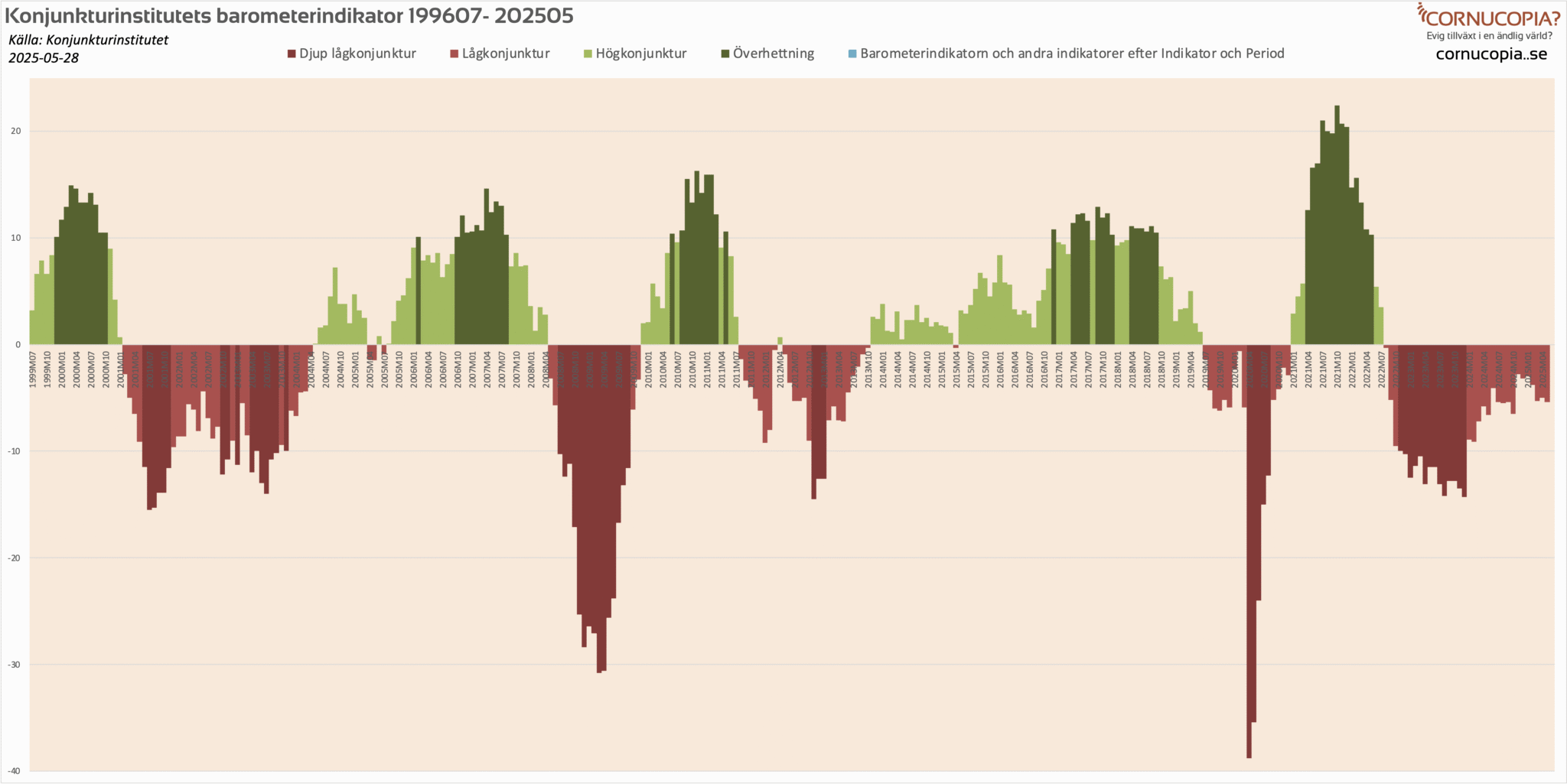 Konjunkturbarometern är i stort oförändrad men backar något medan byggbranschen går upp i högkonjunktur med knapp marginal. Barometern baserar sig på enkäter och inkluderar både frågor om nuläge och framtidstro, varför det inte bara säger hur det är exakt nu, utan även hur det väntas bli. Handel och bygg går framåt, industrin backar marginellt, men det är framför allt tjänstesektorn som faller, medan till och med hushållen blir lite positivare, även om de är kvar i djup lågkonjunktur redovisar Konjunkturinstitutet som skriver: