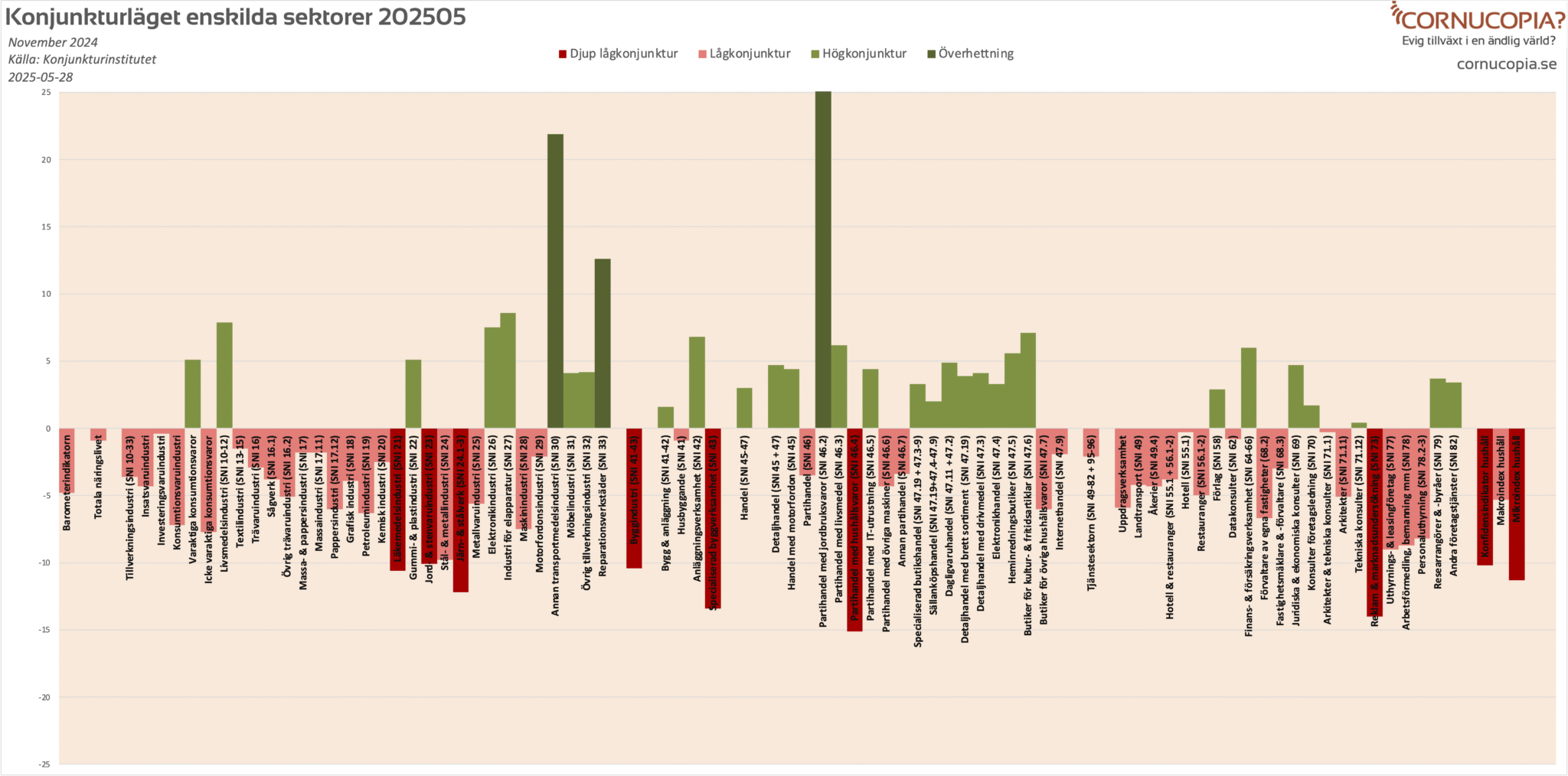 Min helt ovetenskapliga ponduspostulering efter att i 10+ år stirrat på de här graferna är att sektorerna håller på att dra ihop sig till att spreta mindre och lugna ner sig, vilket brukar vara en kraftsamling inför en uppgång i konjunkturen. Som mest spretar det vid överhettning eller djup lågkonjunktur och nu är det inte längre så spretigt.