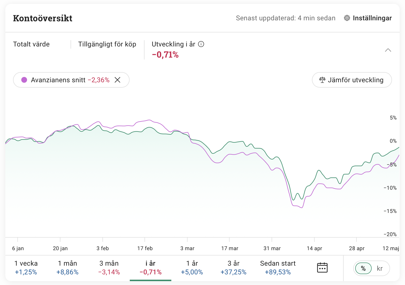 För egen del ligger nu det mesta på plus. Avanzaportföljen anger -0.71% i år i kontrast mot Avanziansnittets -2.36% och på ett år +5.00% i konstast mot Avanzianens +2.97%. Avanza är dock notoriskt usla på att uppdatera fondkurser och Avanza Global (som jag reducerat rejält i), Avanza Zero och Swedbank Robur Småbolagsfond Norden är kvar på fredagens kurser. När Avanza inom några dagar lyckats uppdatera sina egna fonders utveckling lär portföljen vara på plus i år.