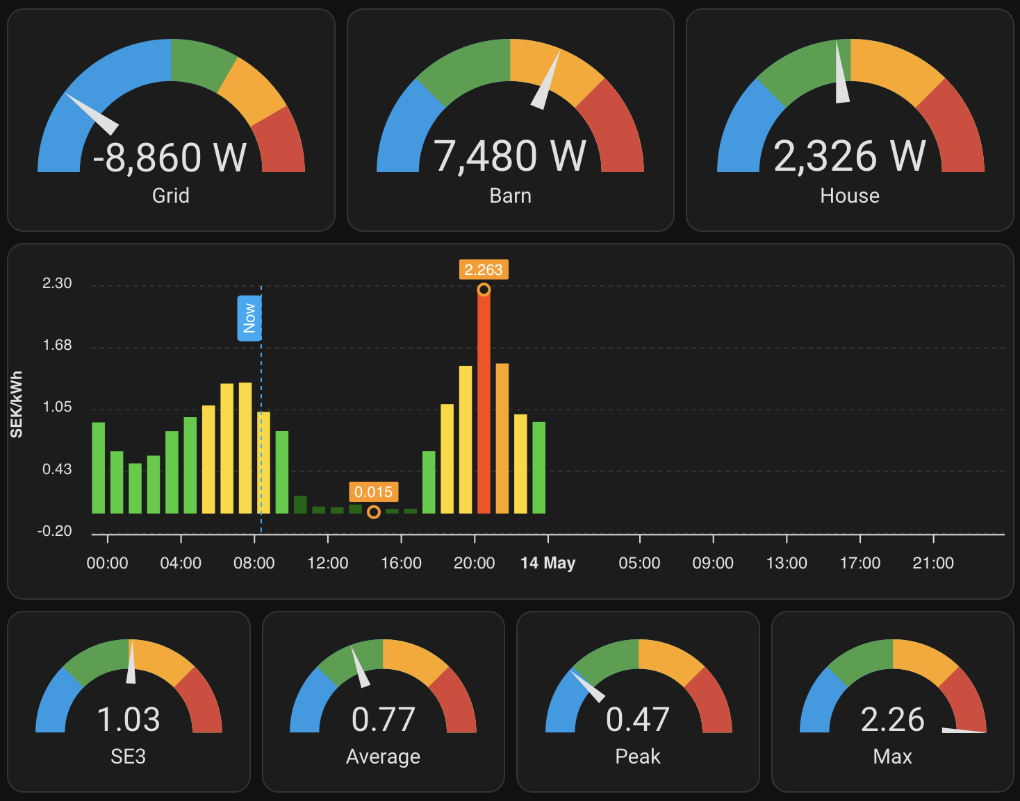 Visst priset på el är ju tom negativt ibland men skatt och nätavgifterna är fortfarande en betydande kostnad. Numera så gäller det att optimera för att inte köpa någon el alls så stor del av året som möjligt. Har installerat 11kwh batteri och det funkar för att ta ner morgon och middagspriserna till ett minimum men ska man kunna undvika kostnader på natten krävs mer lagringskapacitet. Jag kommer att utöka till 22 kwh nästa år när det finns nya bidragspengar att nyttja. Jag tror det kommer att räcka rätt bra. På vintern när solen är borta så borde det räcka till lite arbitragehandel. Med det system som jag byggt med så kan man uppgradera till 3 x 22kwh men så mycket behövs inte. Har också möjlighet till ö-drift. Så situationen blir ännu värre så finns alternativ.