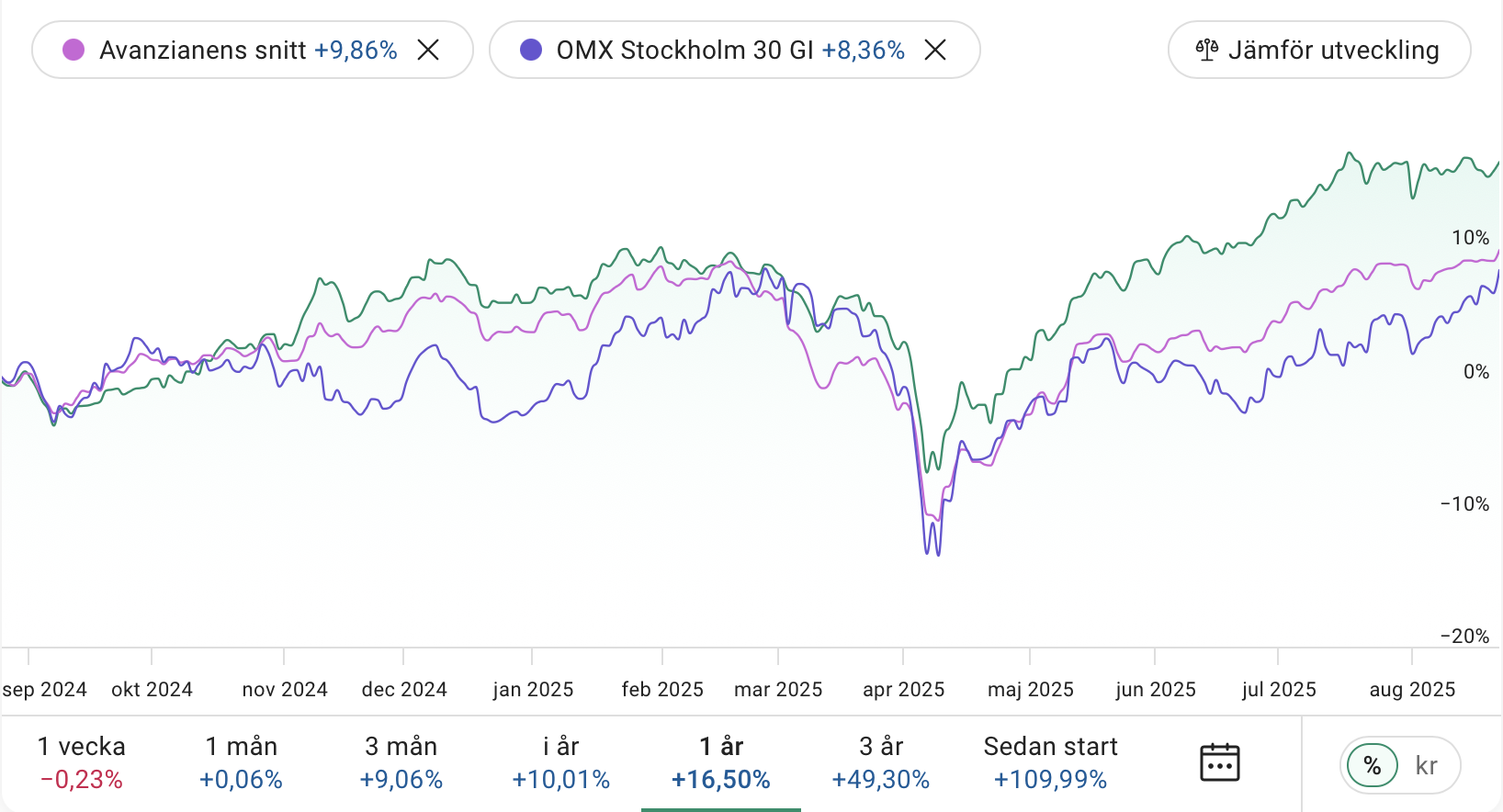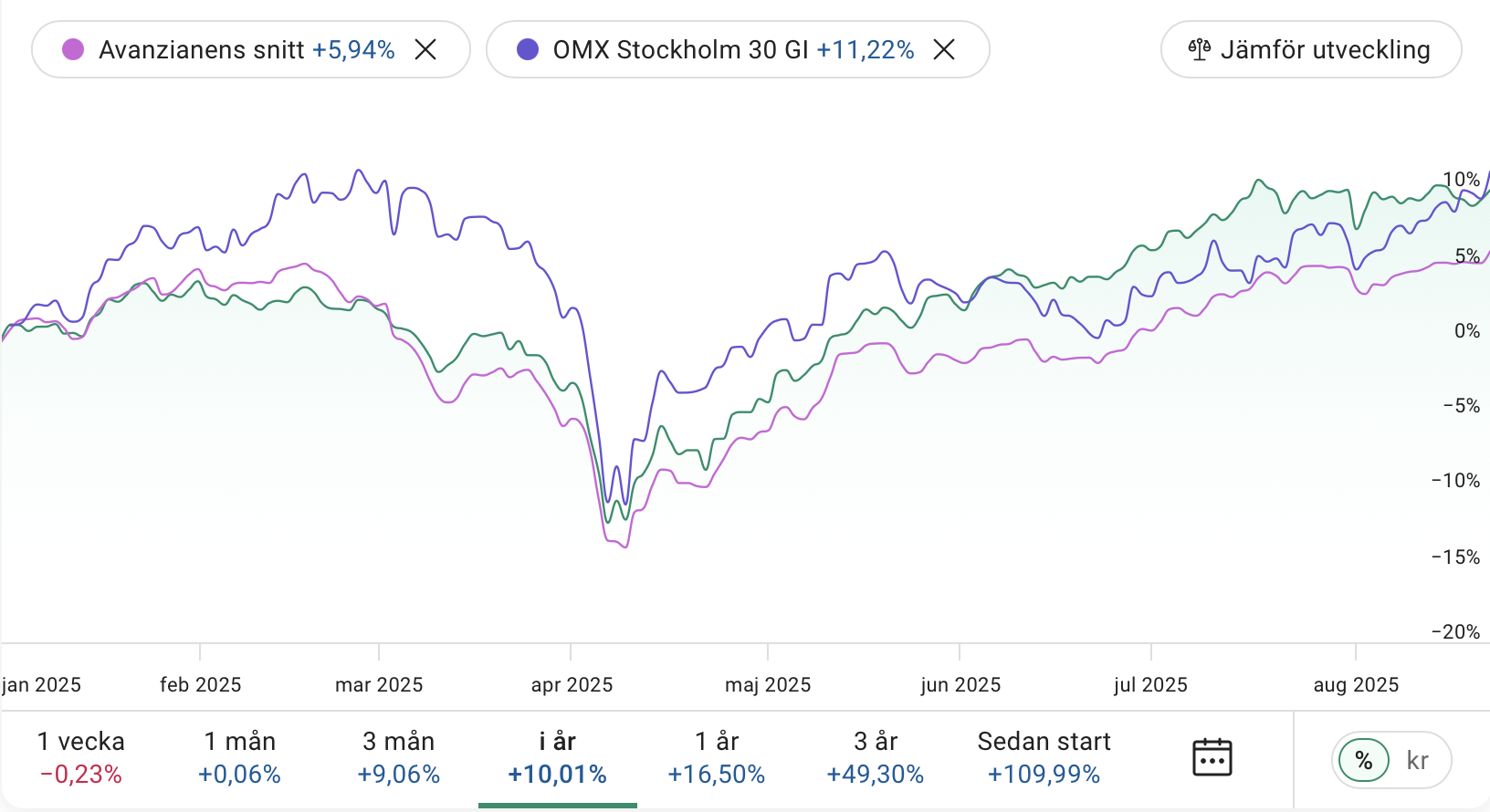På tal om apor så läser du en text av en apa just nu. Min aktivaste portfölj är upp +10.01% i år medan OMXS30GI alltså är upp +11.22%. Dock har inte Avanza uppdaterat kurserna för AVanza Global och Avanza Zero för i fredags. Starkt bidragande till att ha blivit nedgraderad till apa är att Trumpregimens teater kring fredssamtal om Ukraina sänkt försvaraktierna och ca 20% av innehavet ligger i Finserve Global Security Fund. Nåja, det finns fler apor. Avanzakundens snitt i år är +5.94%.
