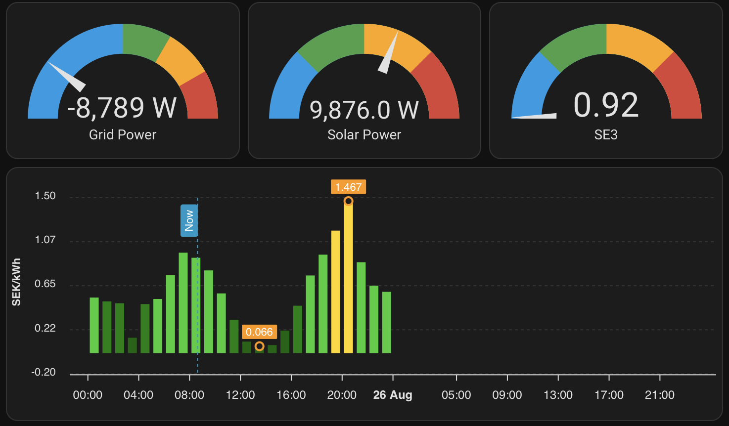 Har hittills köpt 7,3 kWh och sålt 603 kWh under augusti, bor i SE3 och har bl.a. elupvärmt SPA-bad och svindyr effektavgift, så det lönar sig med solceller och batteri! 🙂