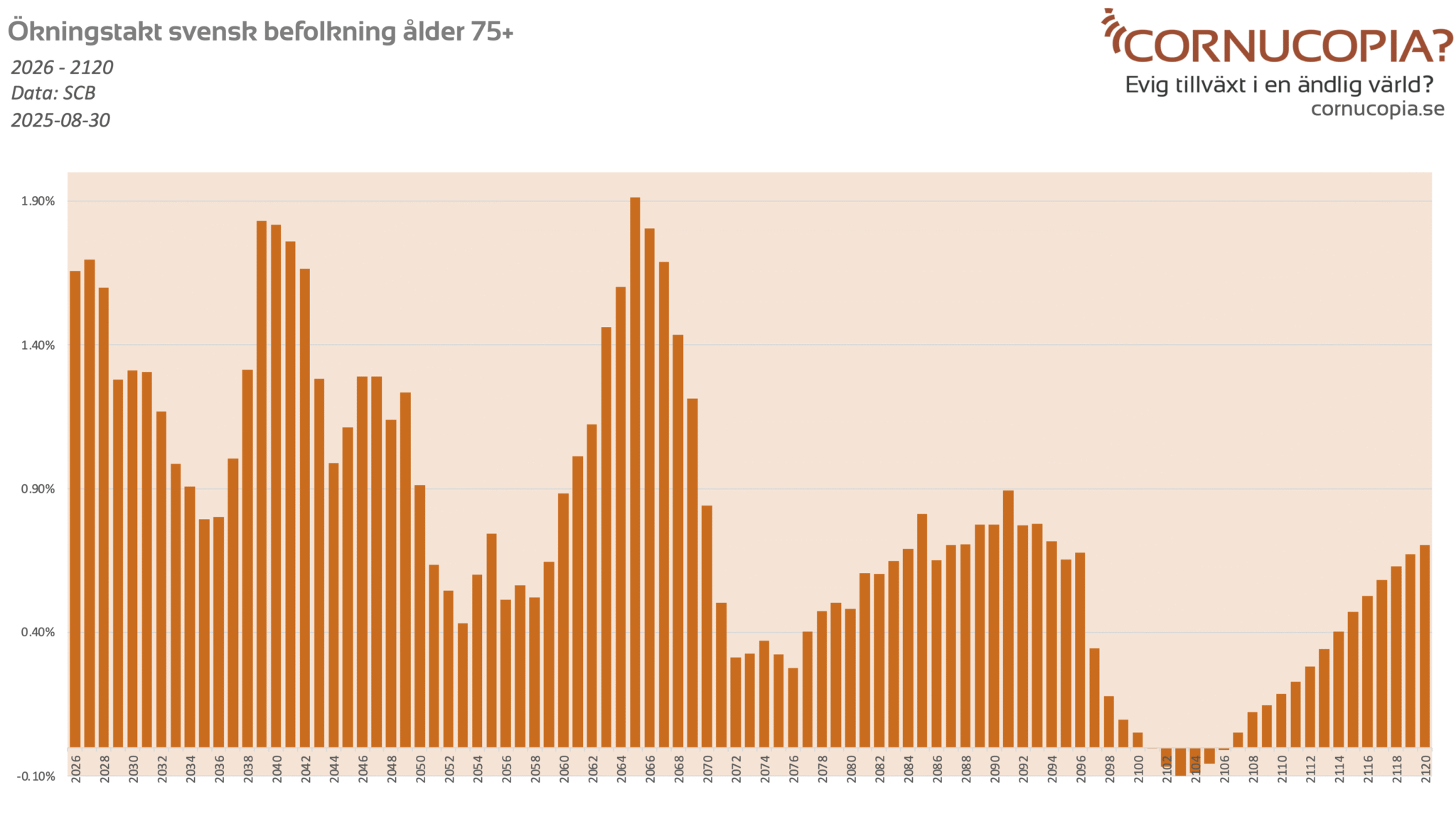 Faktum är att om man tittar på SCB:s senaste befolkningsframskrivning så ökar antalet äldre åldern 75+ med i snitt 7.7 promille (eller 0.77%) om året fram till år 2120. Den kraftigaste ökningen ett enskilt år väntas bli 1.91% år 2065, men generellt ligger ökningarna betydligt lägre. Graf nedan.
