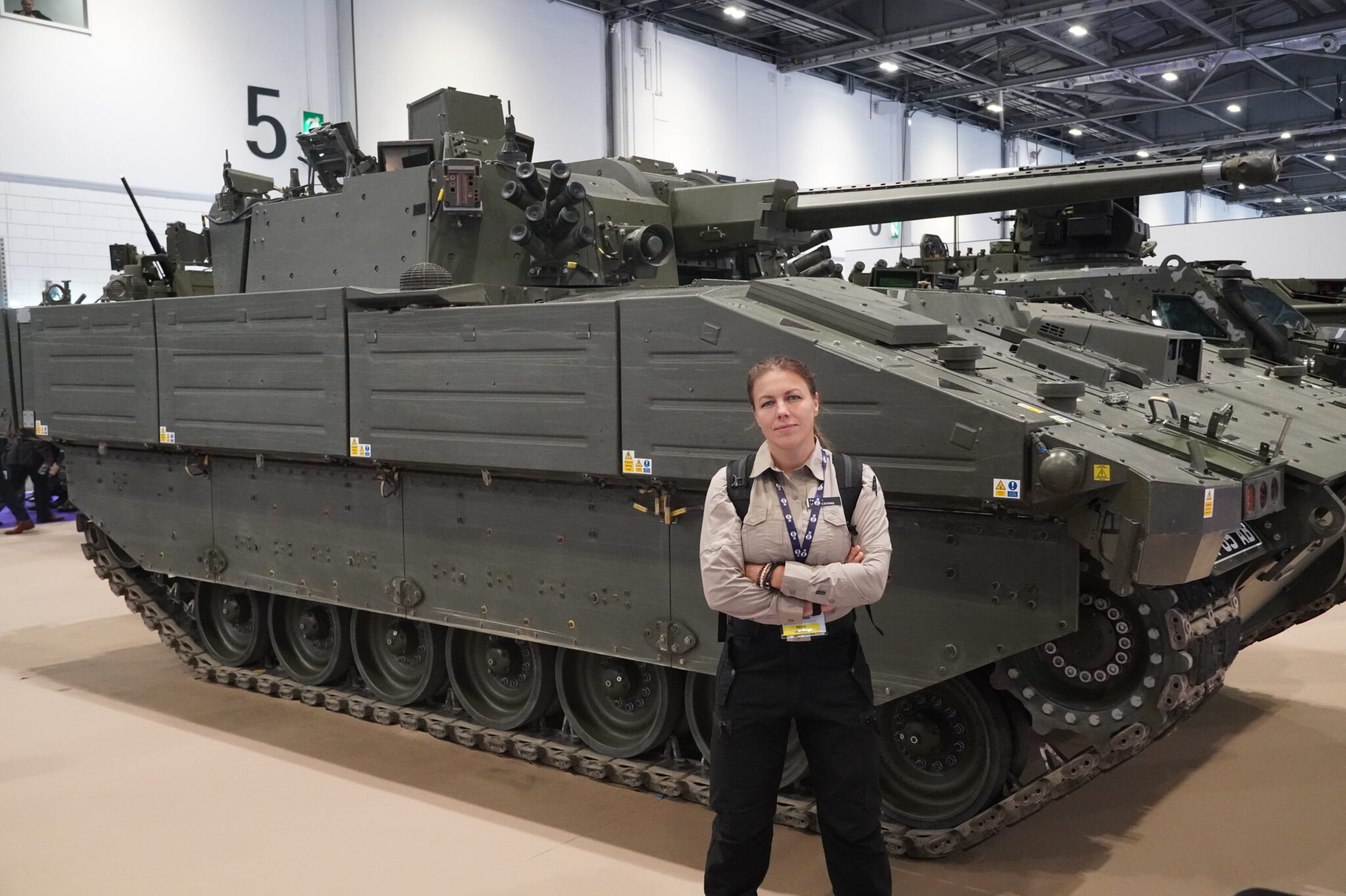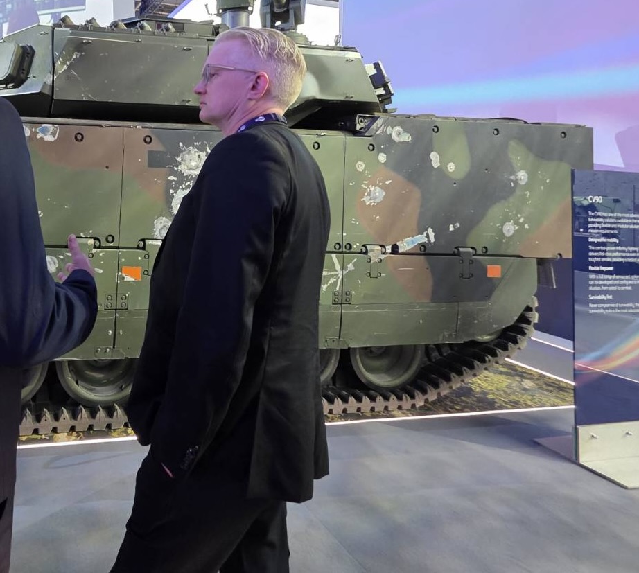 Som trängst var det i BAE Hägglunds monter, åtminstone så till vida att vi inte kunde få ett fullt foto på stridsfordon 90 med nytt nederländskt torn med aktiva APS-motmedel, pansarvärnsrobot Spike och 35 mm automatkanon. Detta eftersom man inte får fotografera andra människor (eller monterinnehåll) utan tillstånd och det verkade aldrig tomt runt CV90.