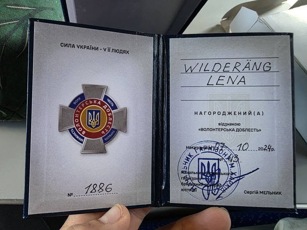 17:16 Lena har varit i Ukraina på nationella räddningstjänstdagen igår och mottagit medaljen Volontärens Tapperhet (ВОЛОНТЕРСЬКА ДОБЛЕСТ). Hon skriver på sin officiella Facebook: