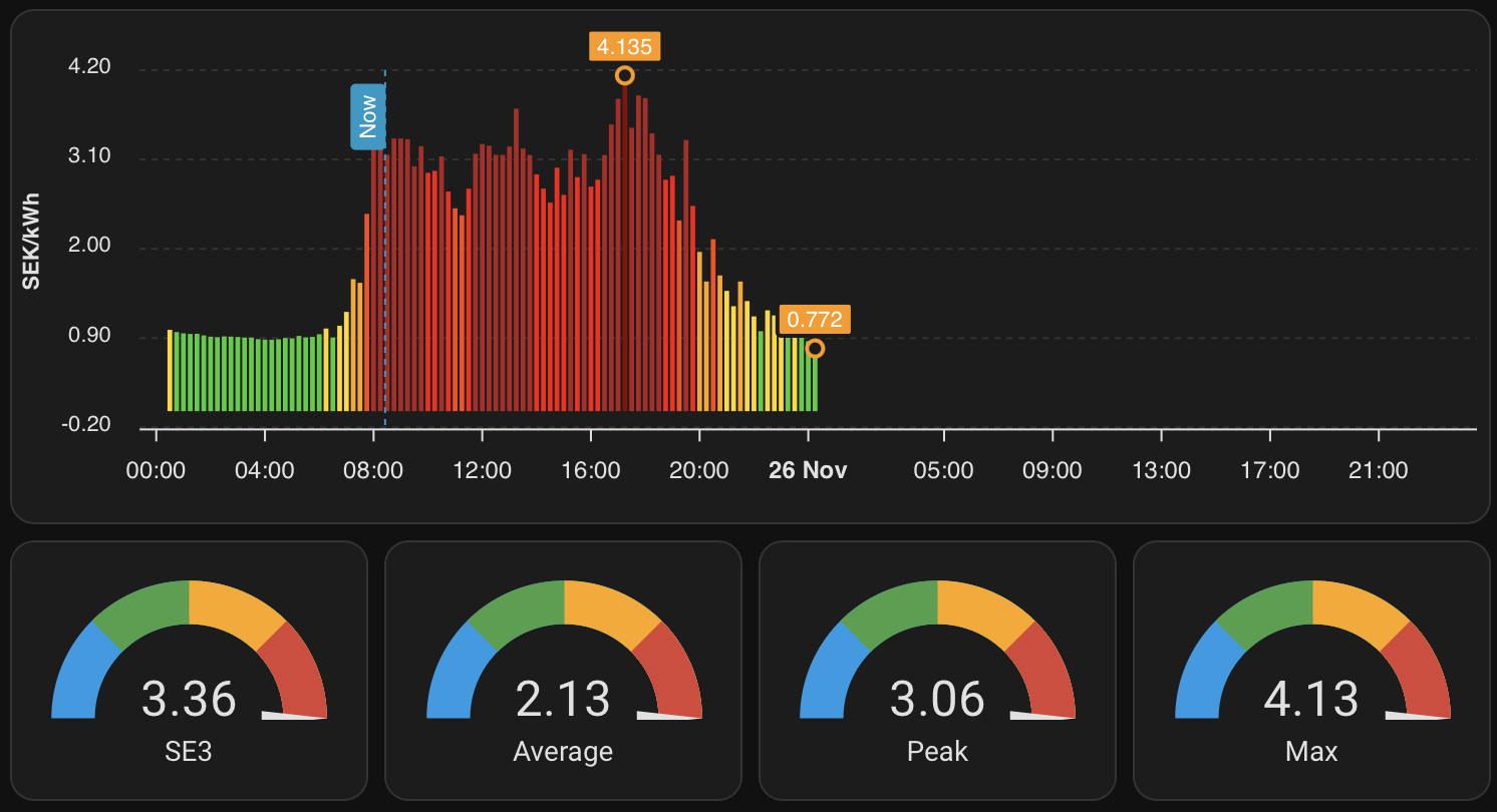 I SE3 snittar det oskattade, omomsade och onätade elpriset på 213 öre, toppar på 413 öre och är ikväll som lägst 77 öre. I SE4 toppar priset på 480 öre per kWh, snittar på 245 och är som lägst 95 öre. Dagtida snttpris i SE4 är 355 öre och i SE3 306 öre idag. Bra för oss med solkraft som kan sälja, och bra möjligheter om man har hembatterier. Prisskillnaderna för er som buffrar med batterier blir som högst alltså 385 öre per kWh i SE4 och 336 öre i SE3.