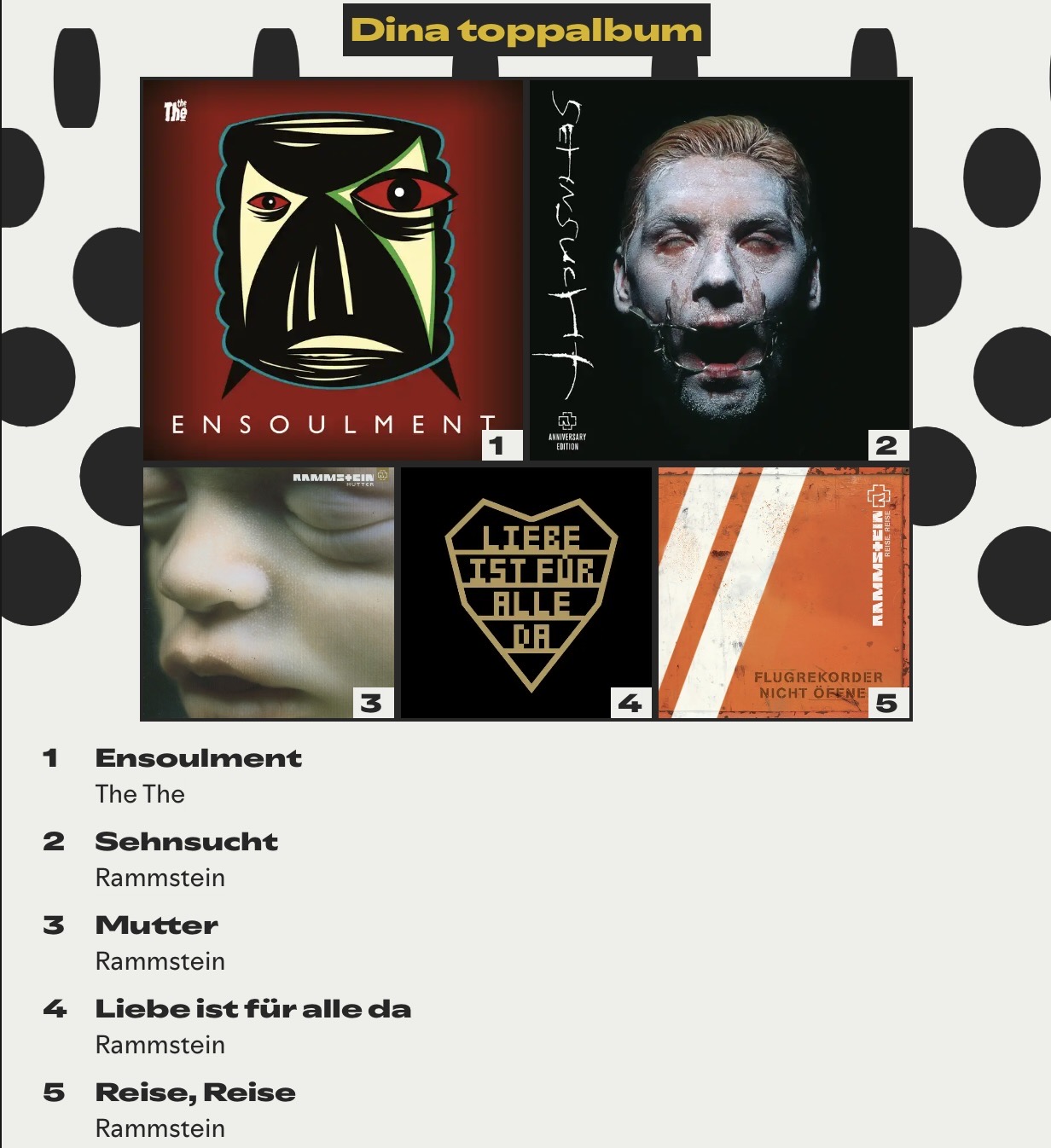 Albumlistan är som man ser annars bara Rammstein. Bra arbetsmusik när man röjer på gården. Lite otippat att jag lyssnat mest på Sehnsucht faktiskt, men det är en bra skiva när man ska köra bil långa sträckor. Kent har förmodilgen dragits in på listan pga avskedskonserten i våras med sagor för barn som är äldre nu.
