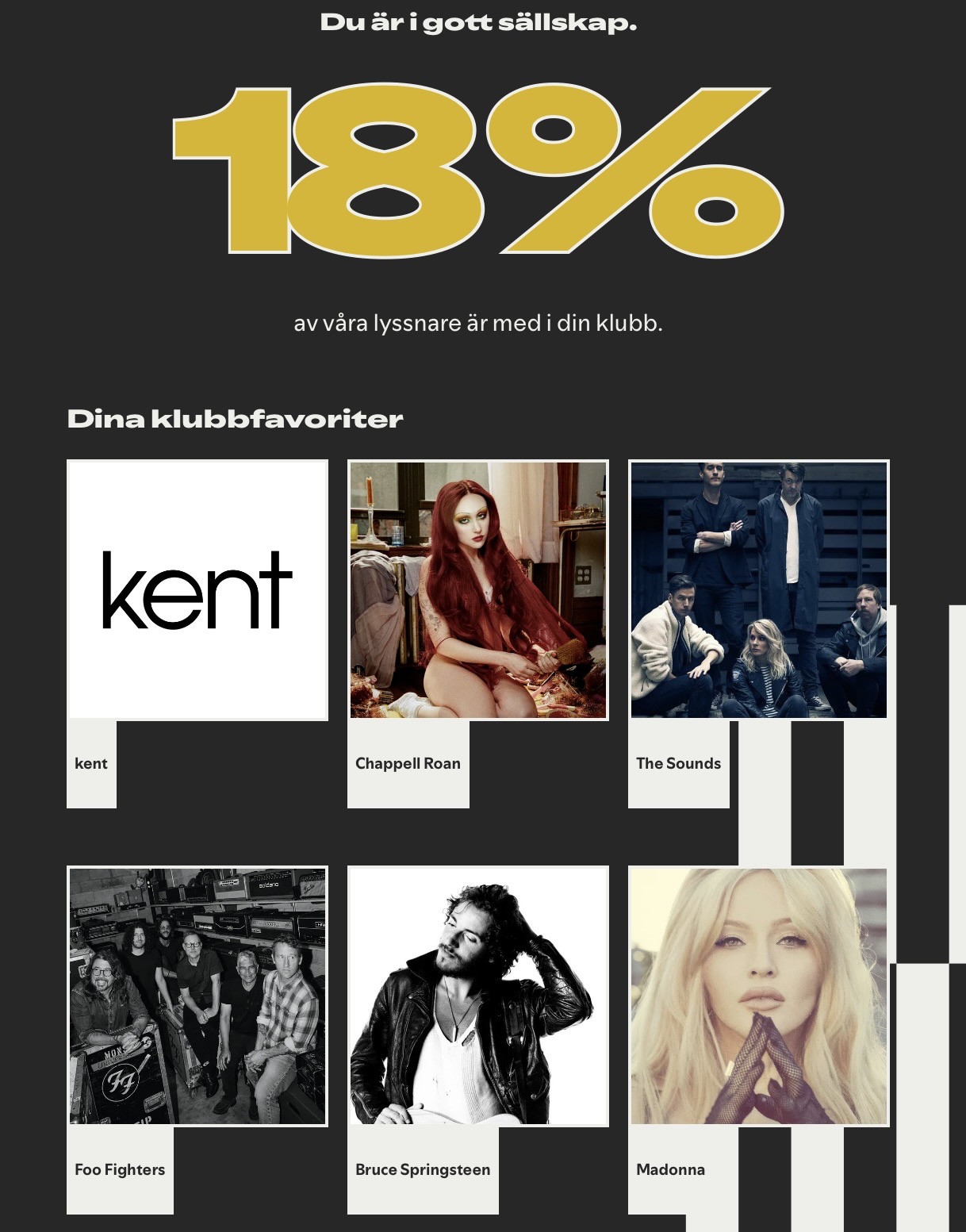Vet inte hur Madonna hamnade på något som Spotify kallar för klubblistan. Har vad jag vet inte lyssnat på en enda låt Madonna (däremot Lady Gaga, men hon fick inte vara med tydligen) men å andra sidan har mitt konto använts på en del sociala tillställningar där någon gäst kanske lagt in Madonna på de gemensamma spellistorna. Vet inte heller om Bruce Springsteen och Foo Fighers kan klassas som klubbmusik. Eller Kent.