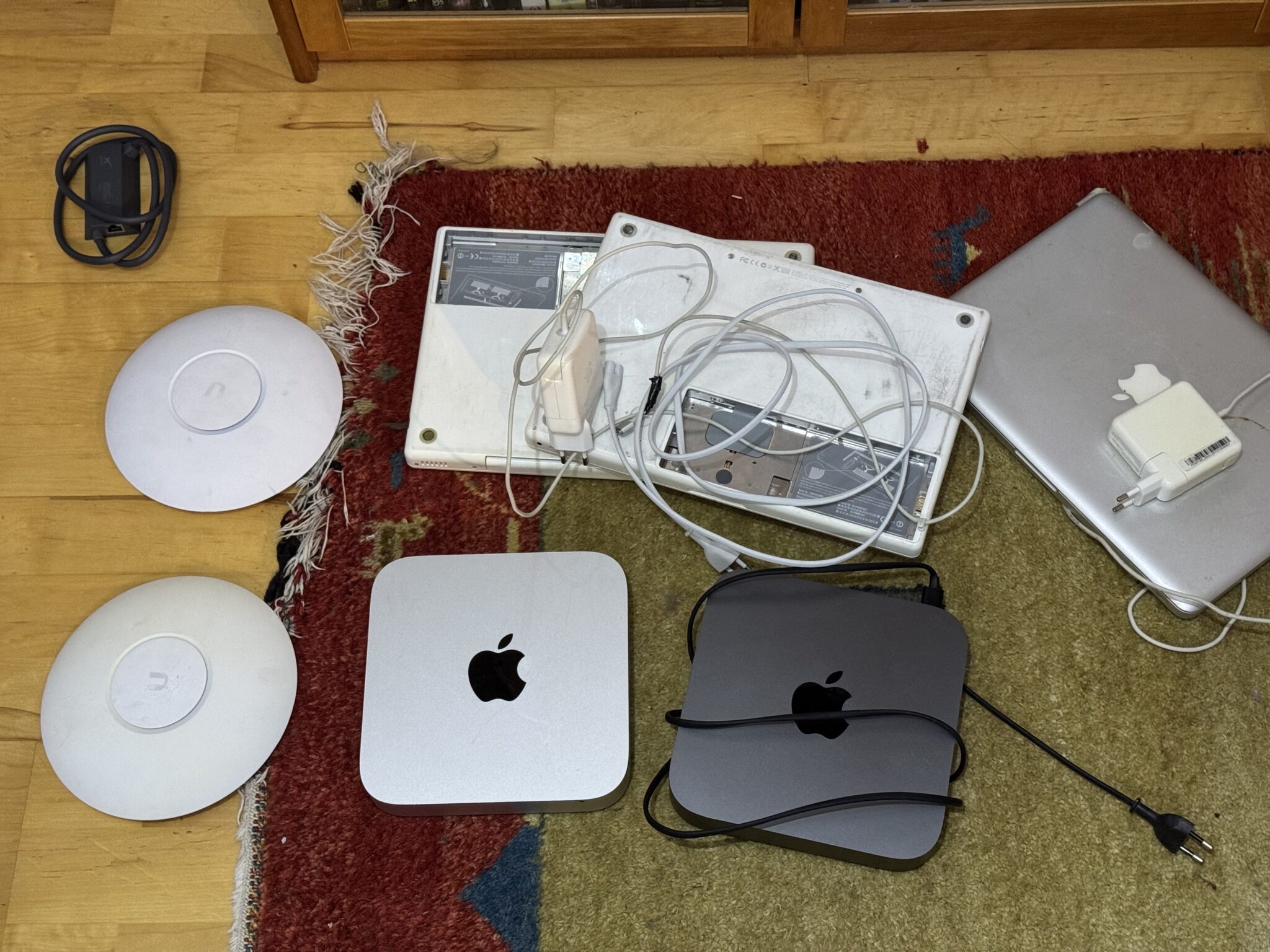 Det är väl även dags för miljöåtervinning av två gamla MacMini, eller iaf den ena av dem, medan den andra kanske fortfarande betingar ett värde då den tillhör en generation med USB-C och nog har SSD-diskar, men är nog Intelbaserad om jag minns rätt. Två Unifibasstationer AP AC Pro. En ethernetadapter för Starlink, och tre gamla Macbooks – den äldsta vita är nog typ 23 år gammal och köptes 2003. Batterierna på bägge har svällt och plockats ut om någon undrar.