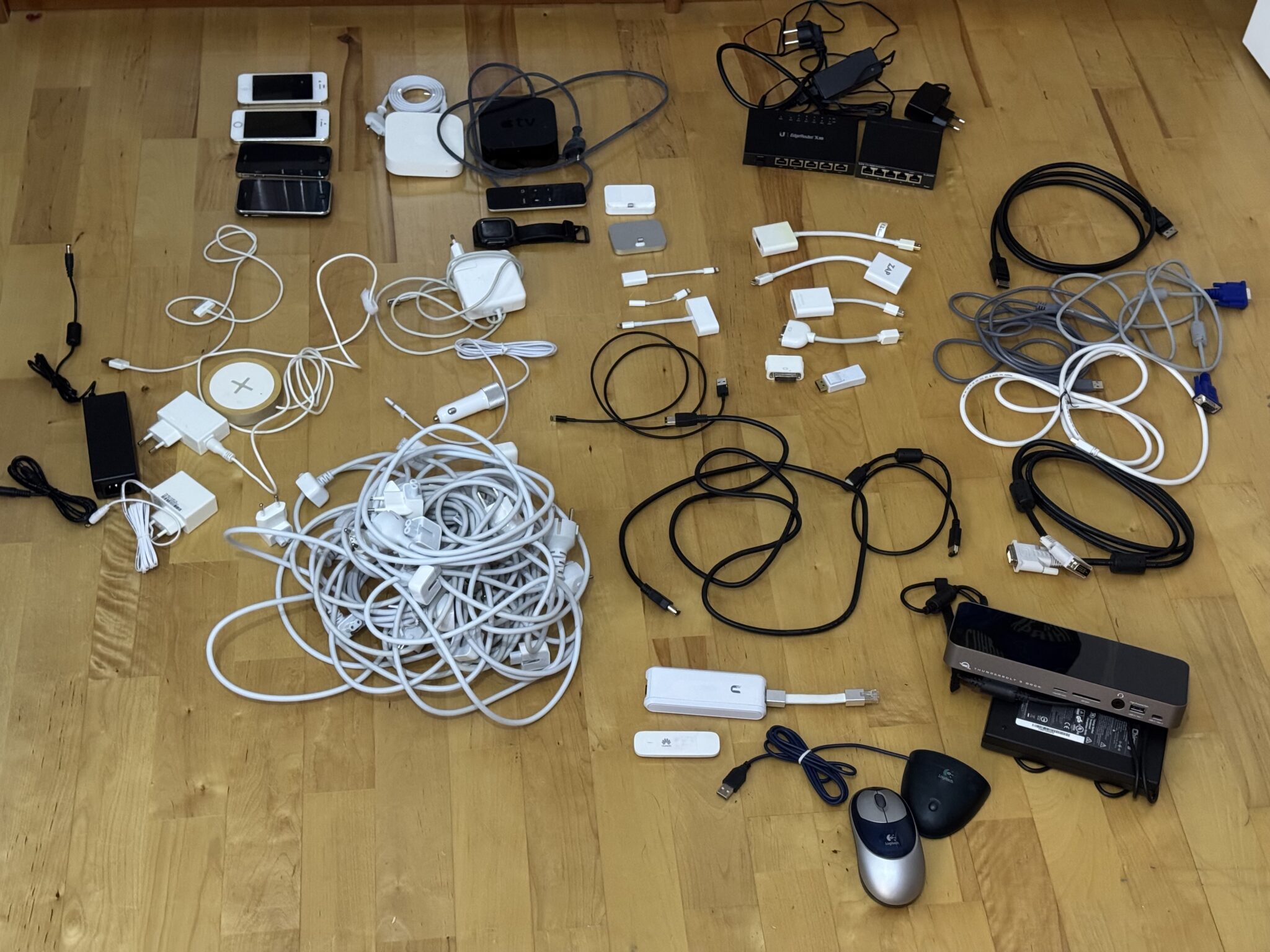 Fotot visar det som jag hyfsat fortfarande vet vad det är, inklusive udda saker som Apples gamla Firewire, eller Thunderbolt innan dessa gick över till USB-C. ÄVen en del gammal utrustning som samlat skräp finns, inklusive en gammal Apple TV, en Apple Airport Express, gamla mobiltelefoner, en EdgeRouter som blev för klen när vi fick en gigabit fiber då den bara klarar 512 Mbit/s, massa VGA-adaprtrar för Thunderbolt från den tiden jag inte hade rutin att alltid ha displayadapter packad i ryggan inför föreläsningar utan packade varje gång och alltså glömde och behövde köpa ny, gamla sladdar till iPhones Lightning-uttag som inte används längre eftersom nya iPhone har USB-C, en enorm hög av gamla Apple-elnätsladdar, gammal trådlös mus från säkert innan 2010, en faktisk Thunderbolt 3 USB-C docka som inte används längre eftersom den är inbyggd i den externa bildskärmen numera, VGA-kablar, DisplayPort-kablar, qi-laddare, en gammal Apple Watch, en Unificontroller osv.