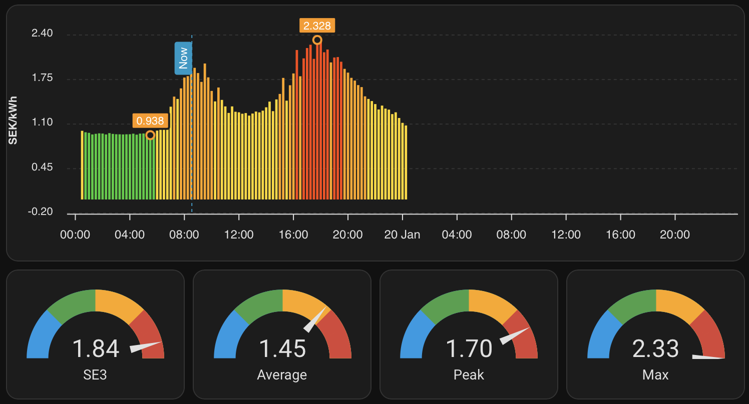 Imorgon har bloggaren ytterligare material till ekonomitråden, då spotpriset inte kliver under 1 SEK/kWh på hela dygnet (samtliga elområden) och toppar på över 3,5 SEK/kWh strax innan kl 17.