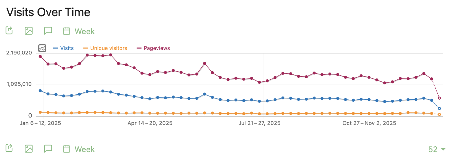 Bland organisk trafik från sociala medier var antalet besök från folks postningar på Twitter 63 656, Facebook 63 450, LinkedIn 9 746, Reddit 5 684, och Bluesky 5 486. Från Mastodon kom 73 besök under året, eller drygt ett besök i veckan, vilket bekräftar att Mastodon är en stendöd plattform för annat än personer med väldigt bestämd självbild och är helt irrelevant för den som behöver generera intäkter.