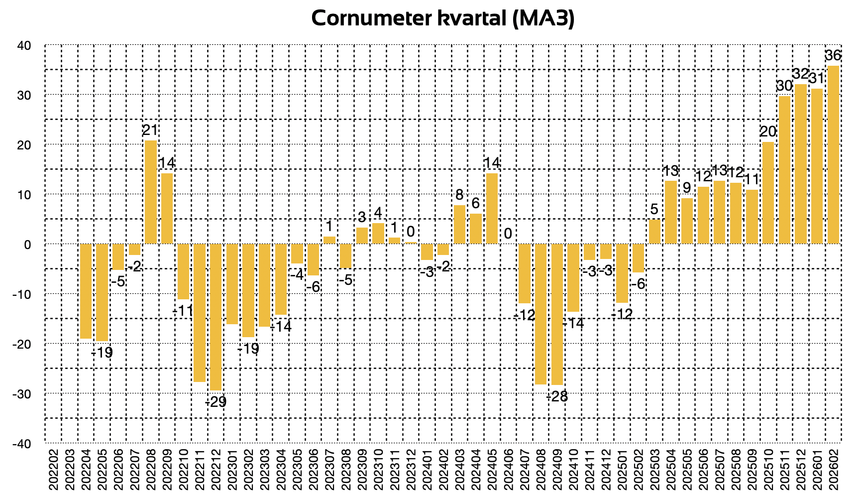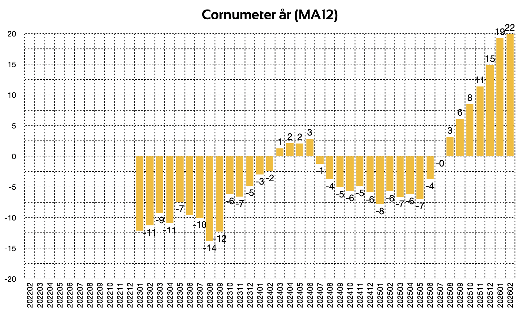 Konjunkturmätaren Cornumetern slog rekord i februari med ett index på 22, som alltså är trafik och säsongsjusterad avvikelse från medlet sedan februari 2022. Den ryckigare Cornumeter kvartal (MA12) slog också rekord.