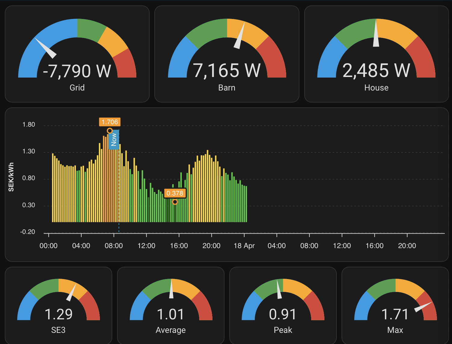 Högsta effekten igår var 16 kW av ca 18 kW installerade, men idag lär det bli mer än 70 kWh produktion. Elpriserna är också angenäma för att sälja solkraft, särskilt nu på morgonen när vi enligt ovan matar ut nästan 8 kW till höga priser.