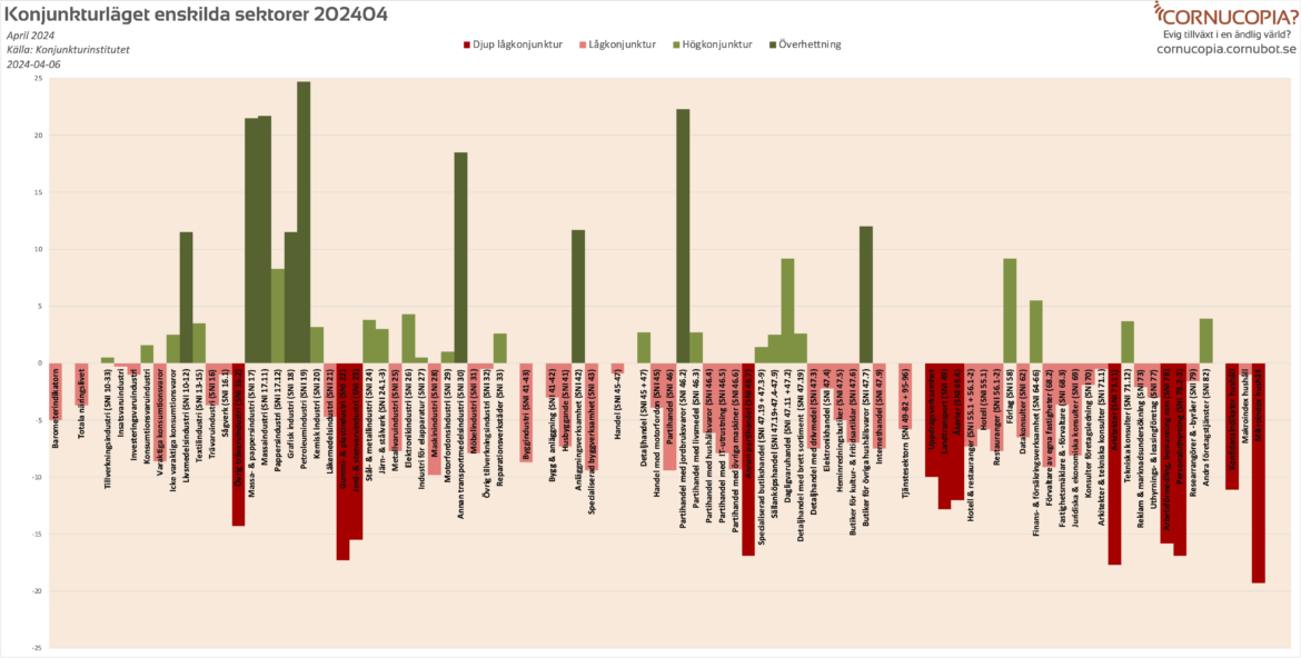 Konjunkturbarometern fortsatte uppåt i april och samtliga huvudsektorer steg, inklusive de manodepressiva hushållen. Även om tillverkningsindustri och detaljhandel nu upplever högkonjunktur sänks den totala kojnunkturen av byggbranschen, tjänstesektorn och framför …