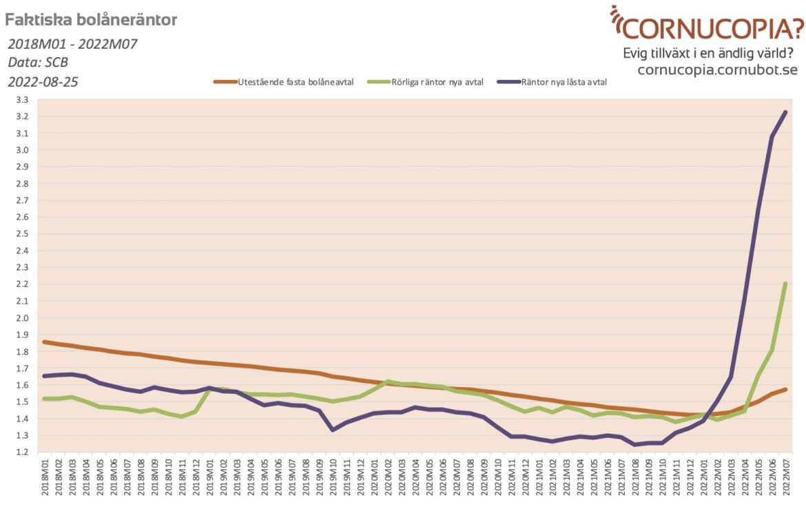 Enligt SCB:s finansmarknadsstatistik har de faktiska bolåneräntorna på rörliga lån ökat med 0.82 procentenheter sedan botten i november och i juli låg nya rörliga lån på i snitt 2.20%. På …