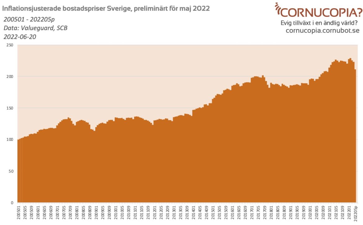 Sveriges största hushållsbank Swedbank höjde just sina bolåneräntor kraftigt. Preliminärt kommer de svenska bostadspriserna ha fallit 8% i maj, justerat för inflationen och är tillbaka på nivåer från i december …