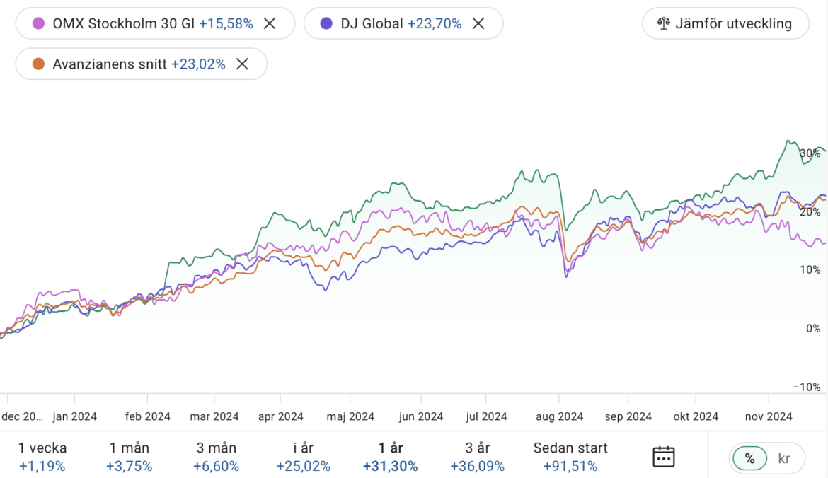 Det har varit ett utmärkt börsår, så dags för en liten portföljrapport där utvecklingen varit +31.30%. Ålder och erfarenhet har lärt mig att det inte är värt timpenningen att försöka …