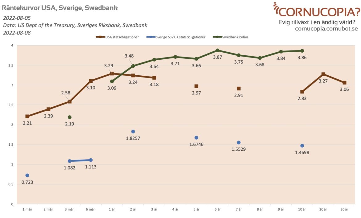 Nedan följer en liten graf över marknadsräntorna på amerikanska och svenska statsobligationer, samt på Swedbanks listräntor. Det finns kanske en slutsats att dra kring de långa bolåneräntorna där. Lite FIRE-raljans …
